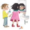 Co by tu pociąć? Bea i Basse idą do łazienki. Może tam coś się znajdzie. Ale papier toaletowy się nie nadaje. Sukienka też nie za bardzo… Wreszcie Bea wpada na świetny pomysł: niech Basse obetnie jej włosy. Rach-ciach – i nowa fryzura gotowa! Tylko co na nią powie mama?