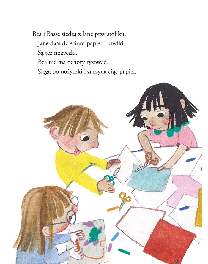 Bea nie ma ochoty rysować. Sięga po nożyczki i zaczyna ciąć papier.