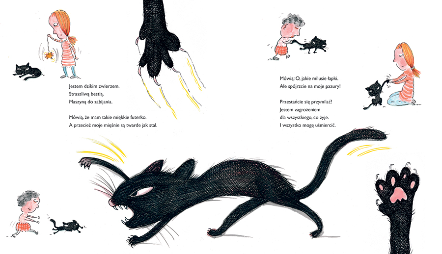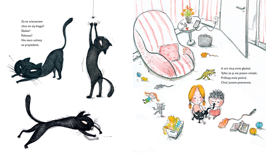 Wyraziste, pełne dynamizmu ilustracje znakomicie podkreślają komizm sytuacji i uwydatniają koci charakter bohatera.
