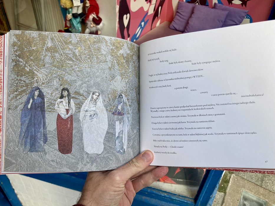 Opowieściom, które układają się w symboliczną podróż na cztery strony świata, towarzyszą obrazy stworzone w różnych technikach przez Czarli Bajkę – od malowania tuszami akrylowymi, przez odbitki techniką sitodruku, po ilustracje powstałe w technikach cyfrowych.
