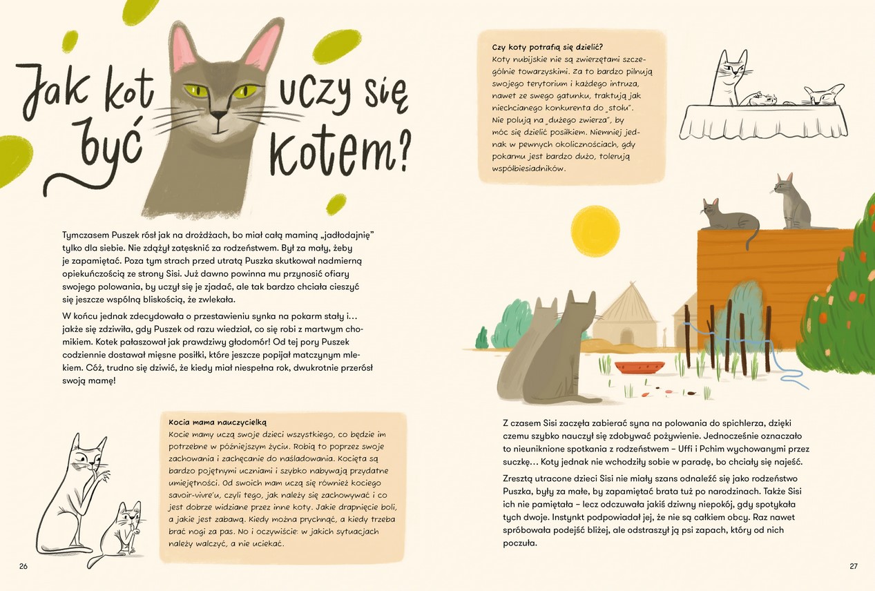 Książka pełna jest przyrodniczych ciekawostek i faktów, które pozwalają lepiej zrozumieć, jak wiele łączy ludzi z tymi tajemniczymi zwierzętami. Sumińska przypomina dawne rytuały, niezwykłe zachowania kotów i rolę, jaką odgrywały w różnych kulturach. Wyjaśnia, dlaczego mruczą, czemu nadal polują i co sprawia, że mimo swojej nieprzewidywalnej natury potrafią obdarzyć nas zaufaniem.