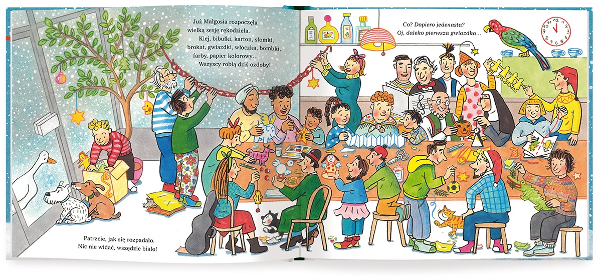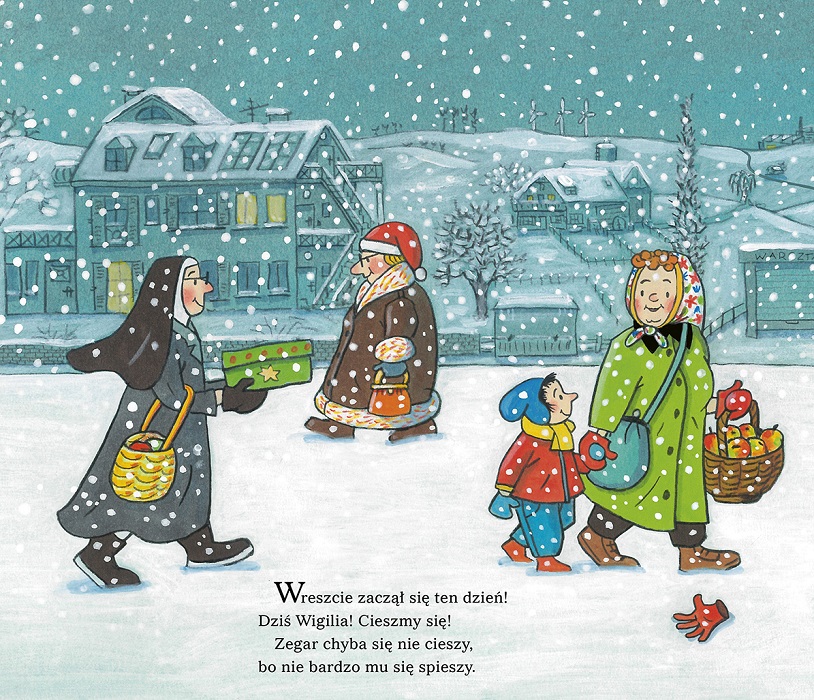 Już Wigilia! Od rana pada śnieg. Ale do wieczoru jeszcze tak daleko… Jak wytrzymać tyle godzin? Mieszkańcy Czereśniowej wpadają na świetny pomysł: spędzą ten czas razem! Będą robić świąteczne ozdoby, jeść barszcz z uszkami i pierniczki, lepić bałwana i śpiewać kolędy. A gdy zapadnie zmierzch – powędrują świątecznym pochodem przez zasypaną śniegiem Czereśniową. Dołącz do nich i poczuj magię świąt!